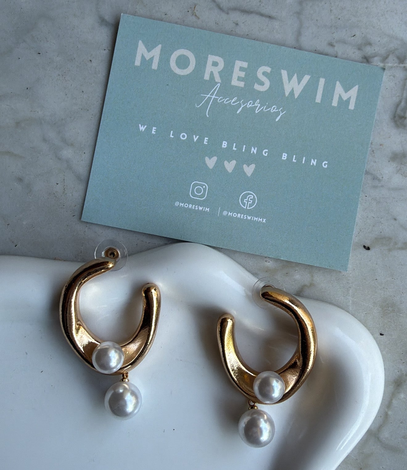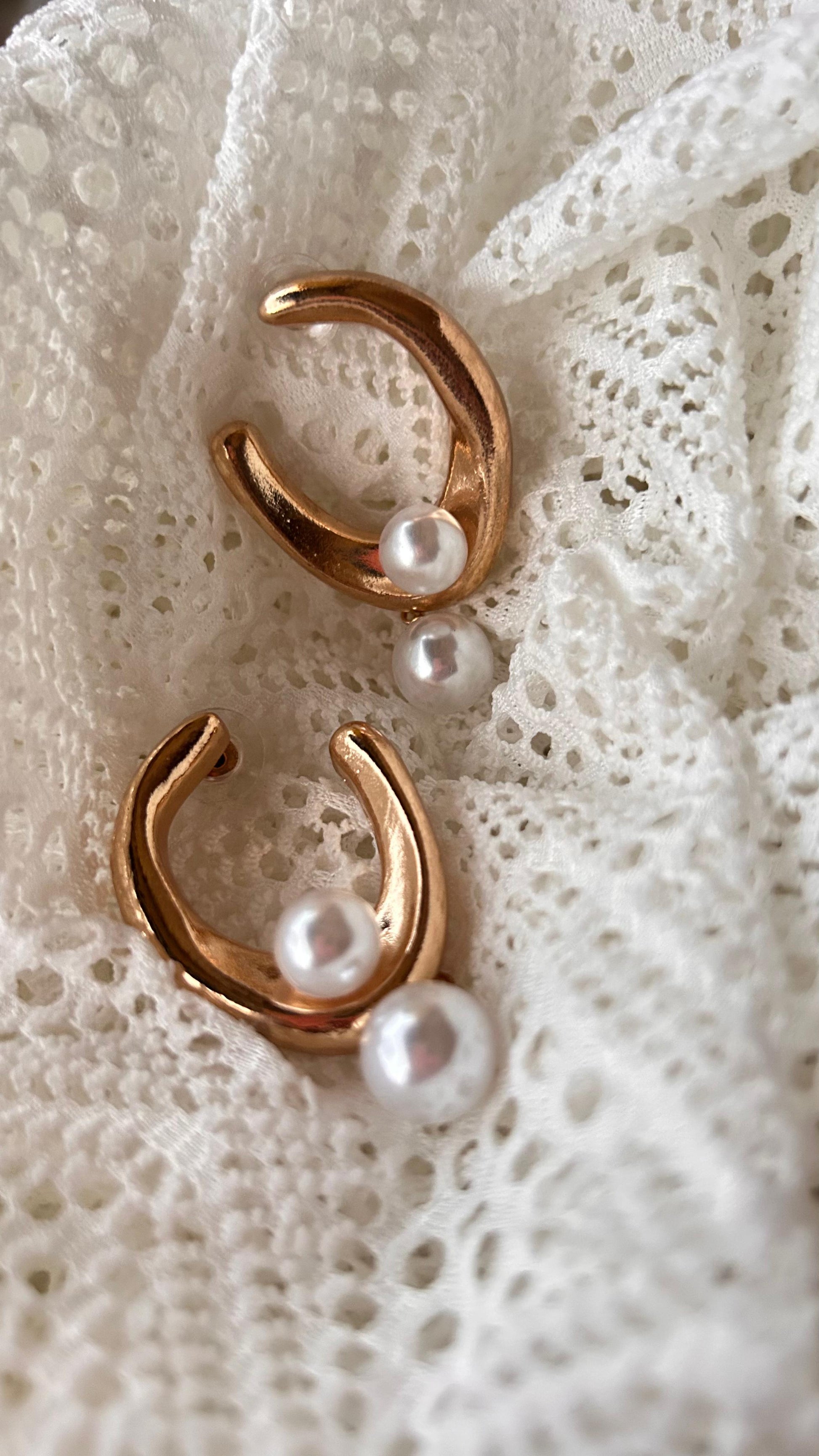 Aretes dorados con perla semi circulares.