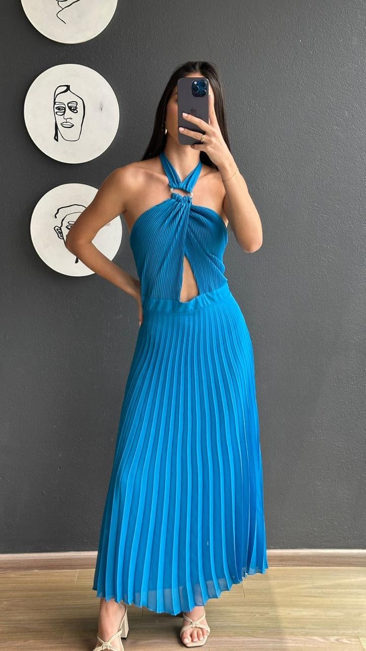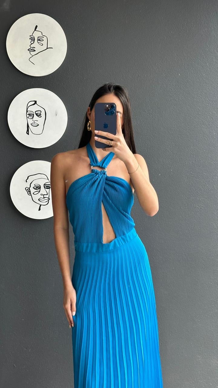Vestido midi con falda plisada, sin mangas con espalda descubierta en color azul. Pequeña abertura en el abdomen.