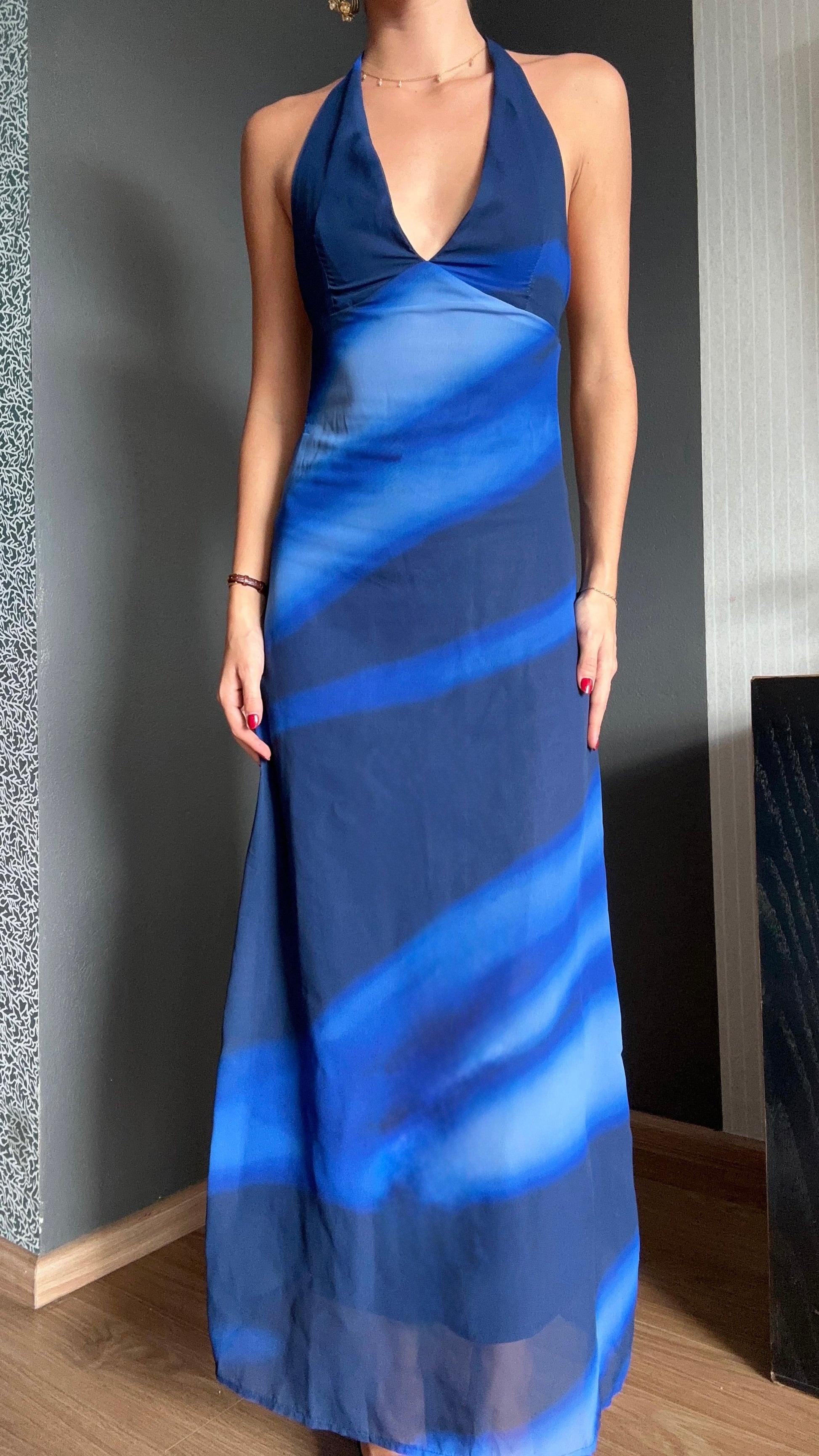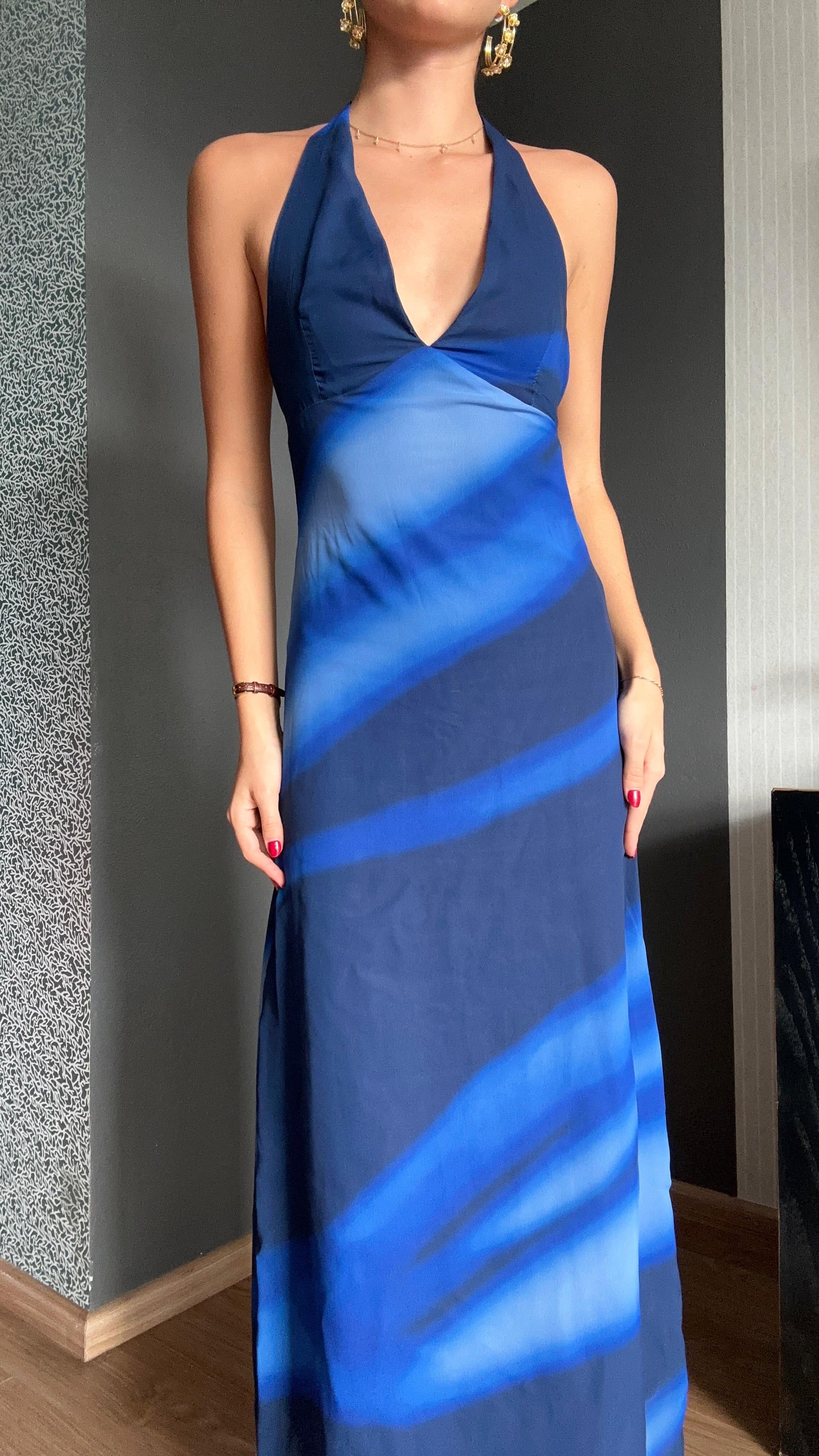 Vestido azul tie-dye con escote en V espalda media. Es perfecto para clima caluroso 🥰