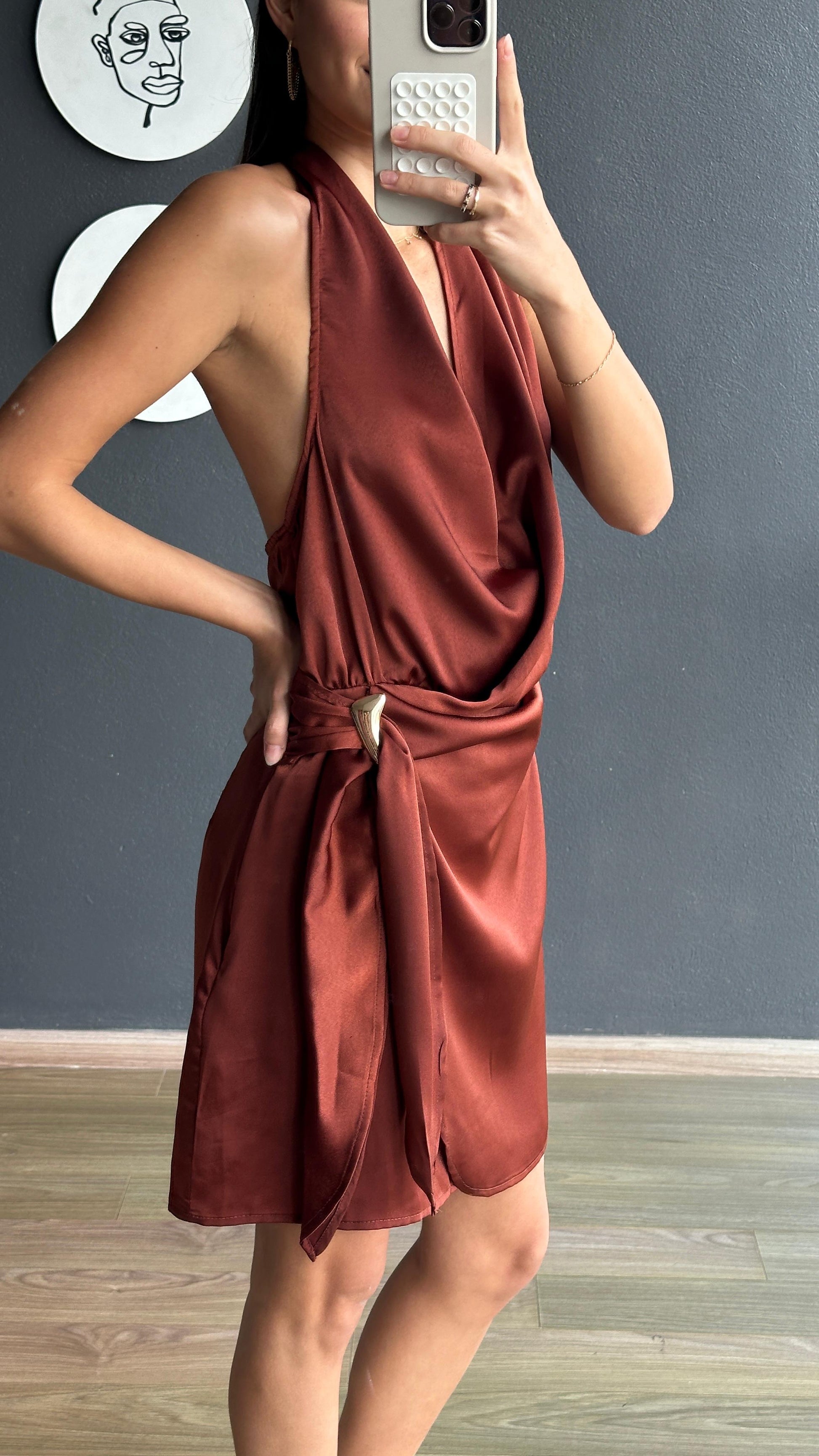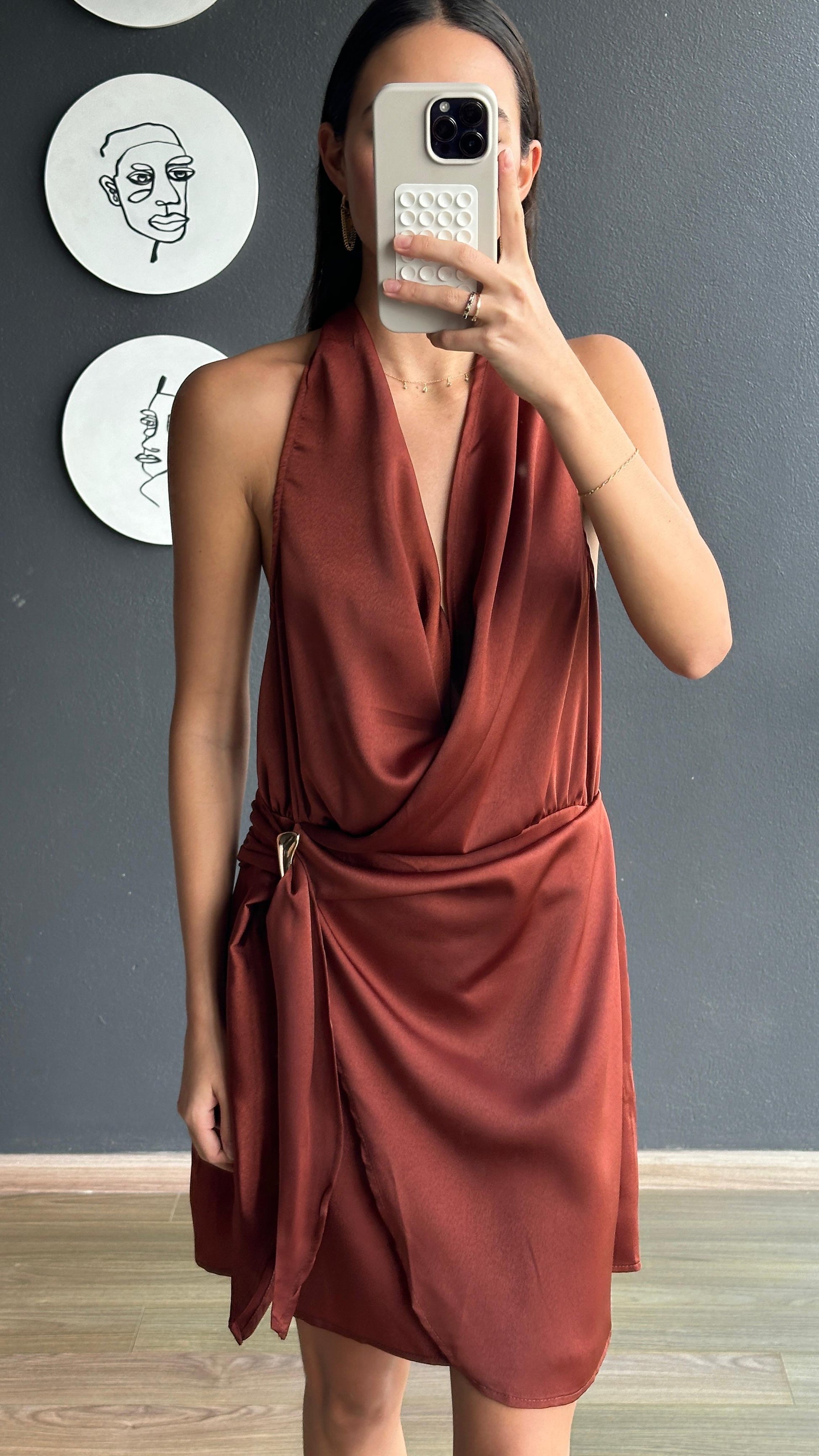 Vestido corto, halter con escote. Tela satinada, perfecto para un evento formal.