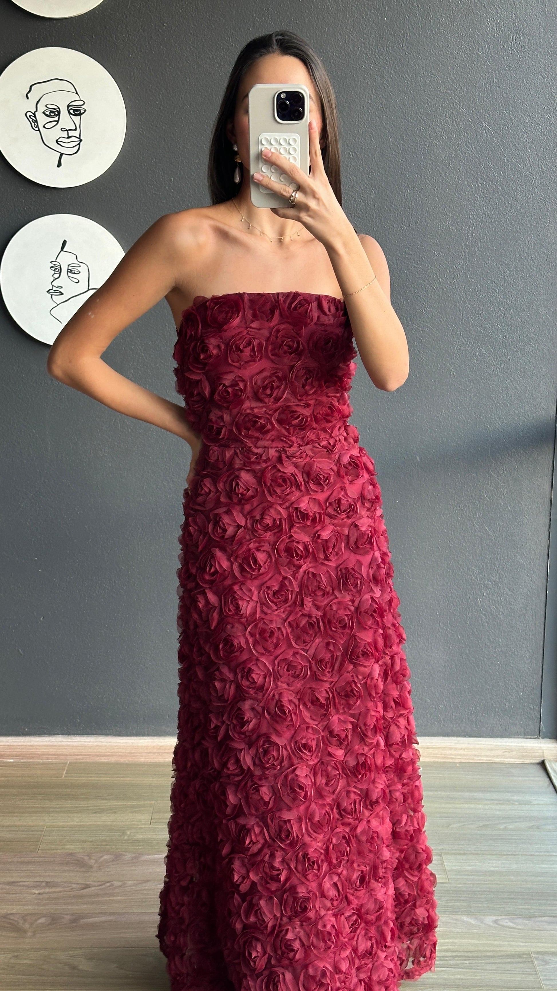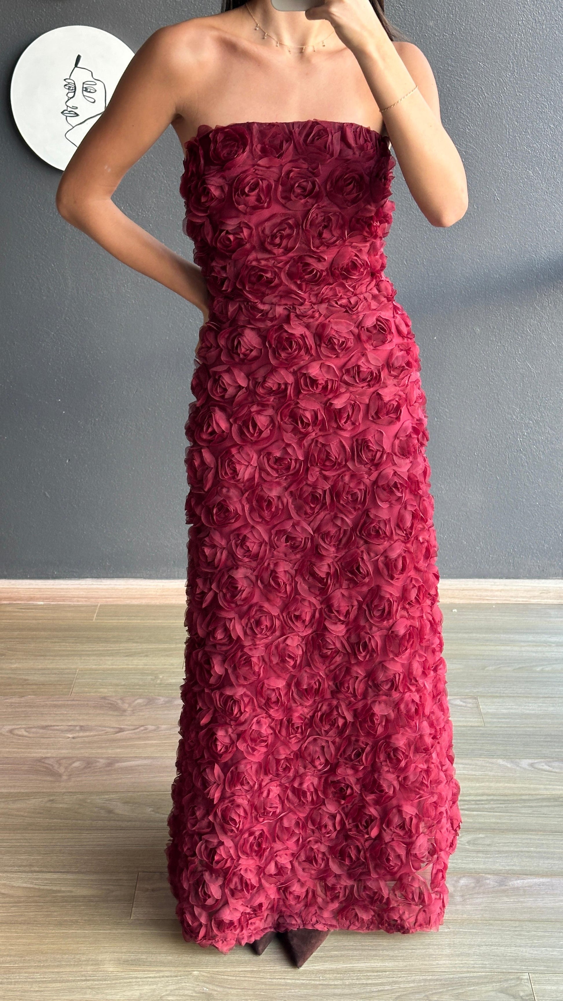 Confeccionado en un vibrante tono vino, destaca por su silueta ajustada en la parte superior y falda amplia que aporta movimiento. Perfecto para eventos formales, galas o celebraciones especiales.
