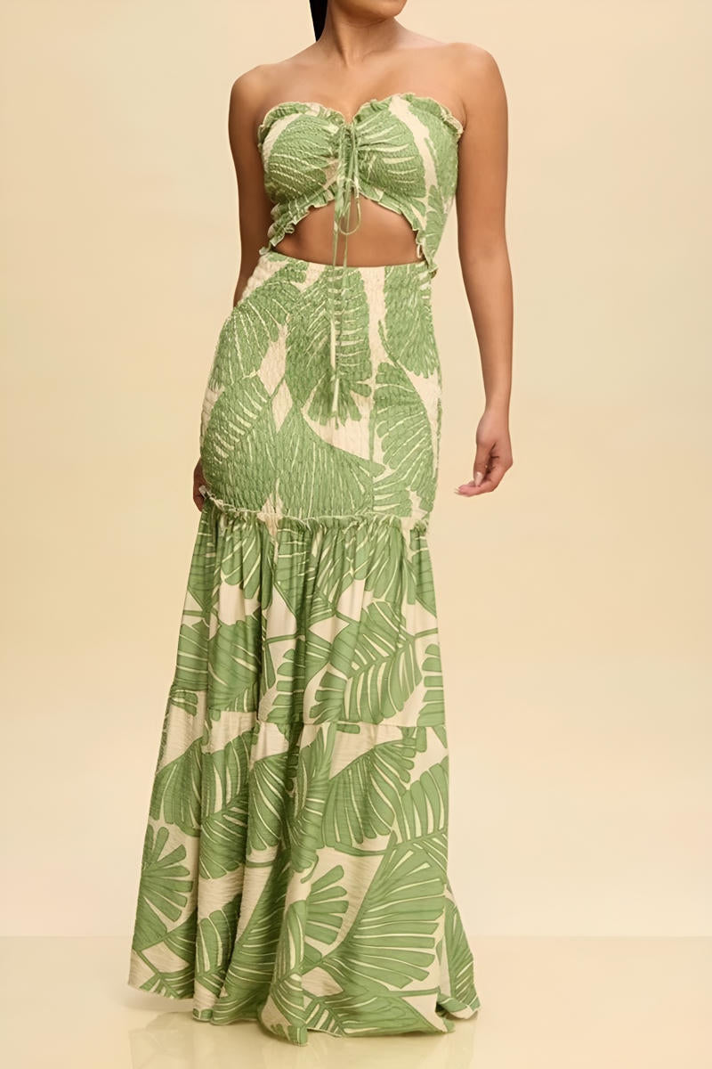 Vestido strapless con estampado verde y blanco. Ideal para una escapada a la playa.