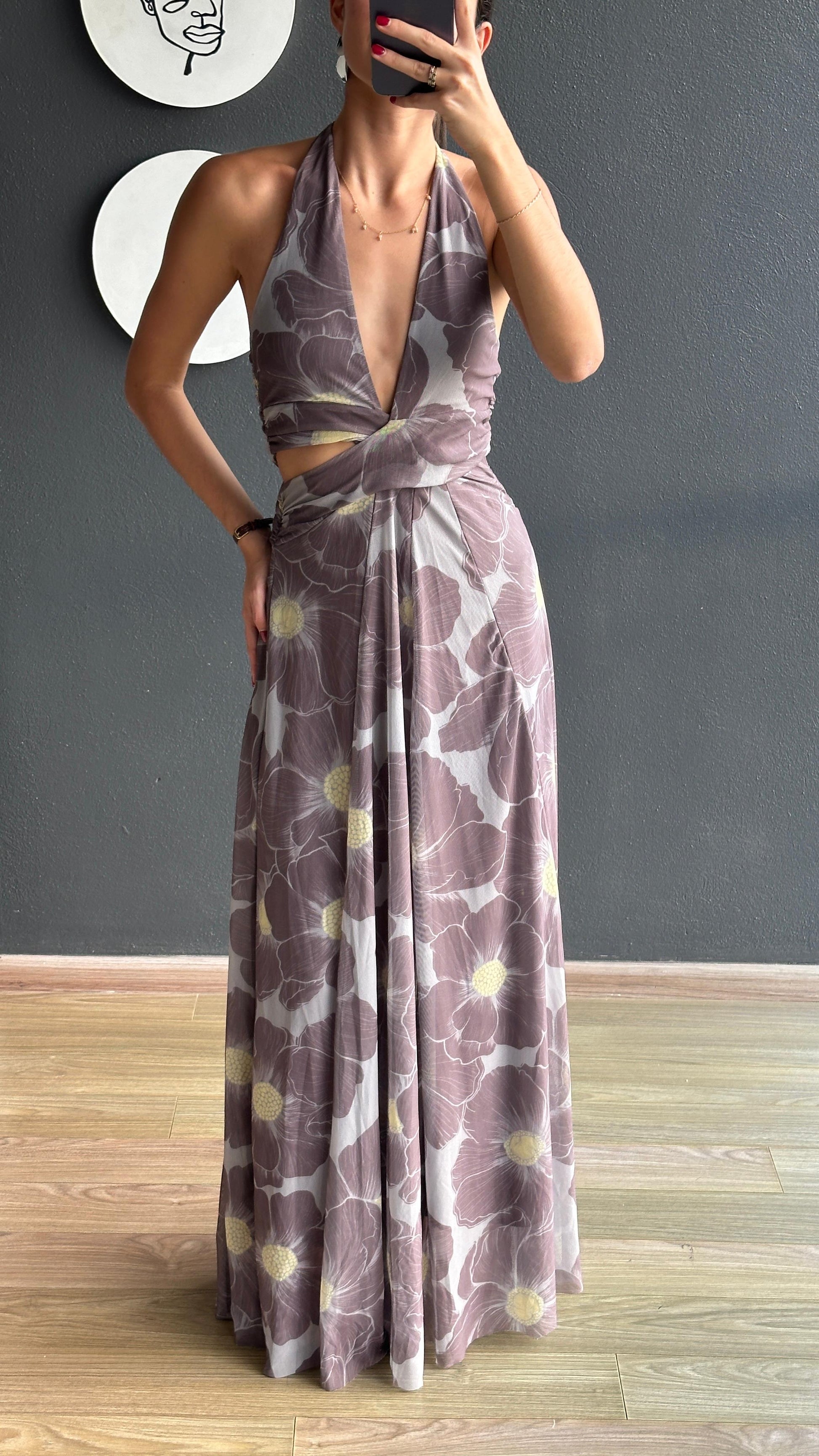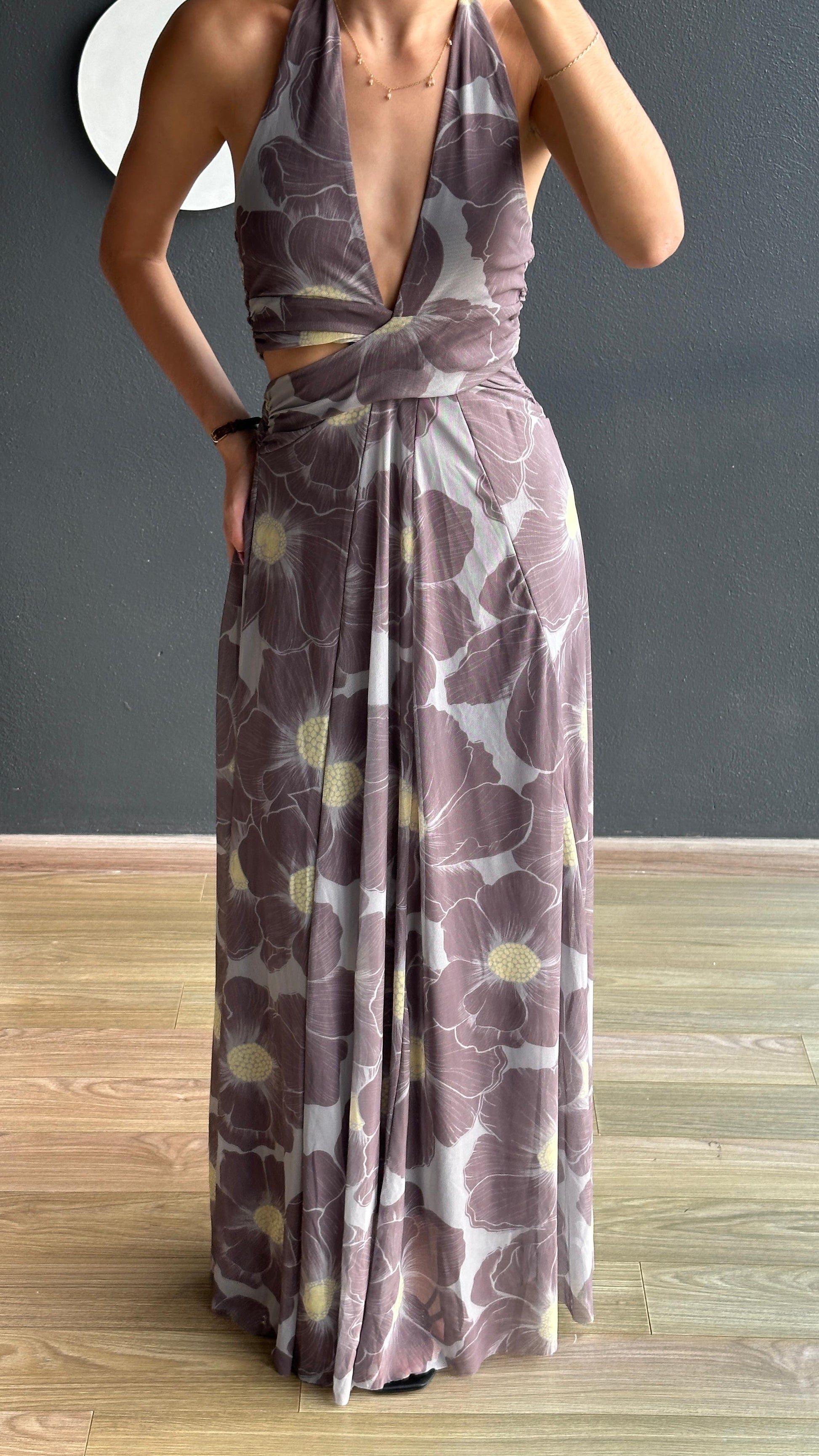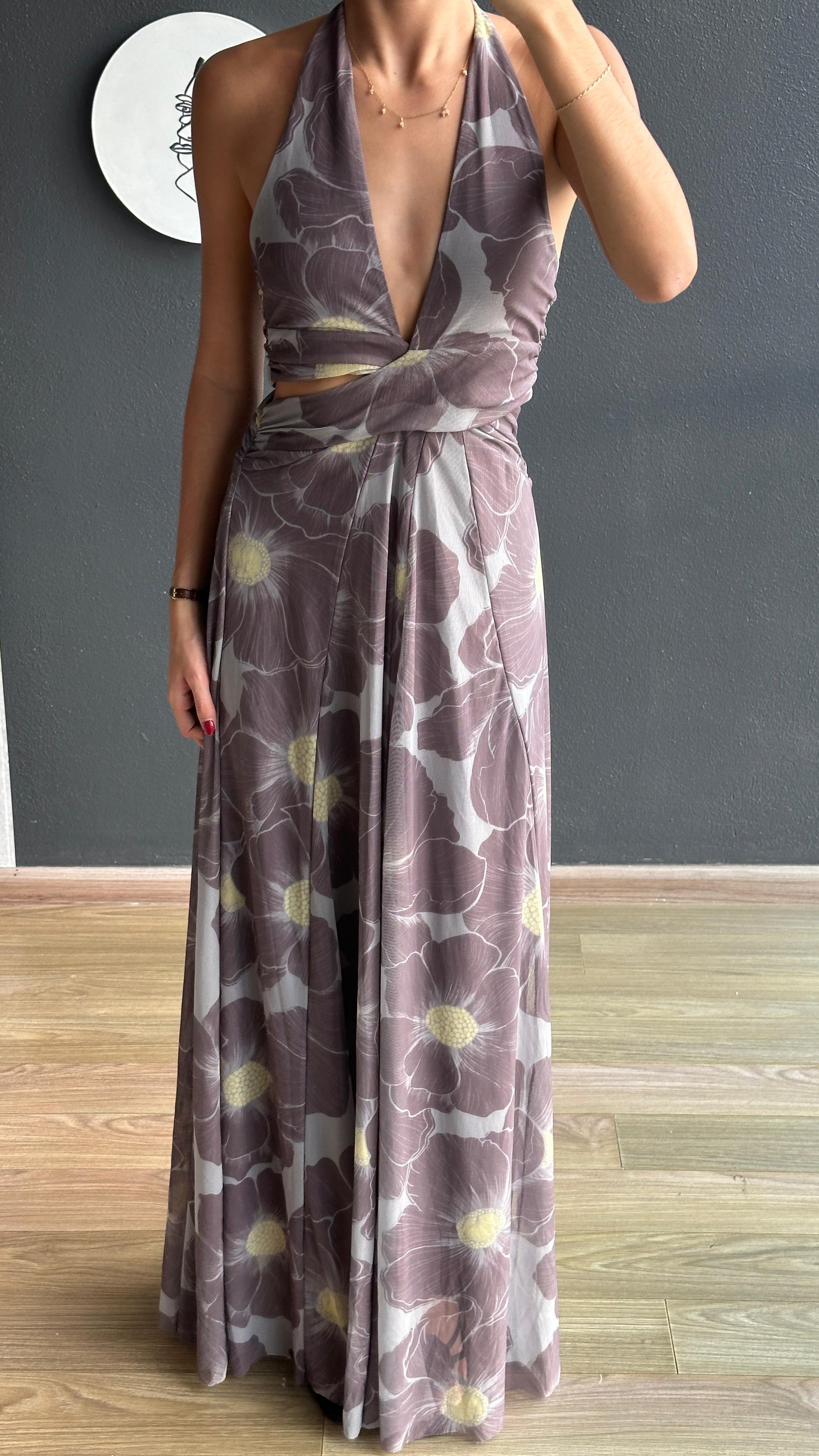 Vestido de gasa con escote en V, pequeña apertura en abdomen, espalda media.
