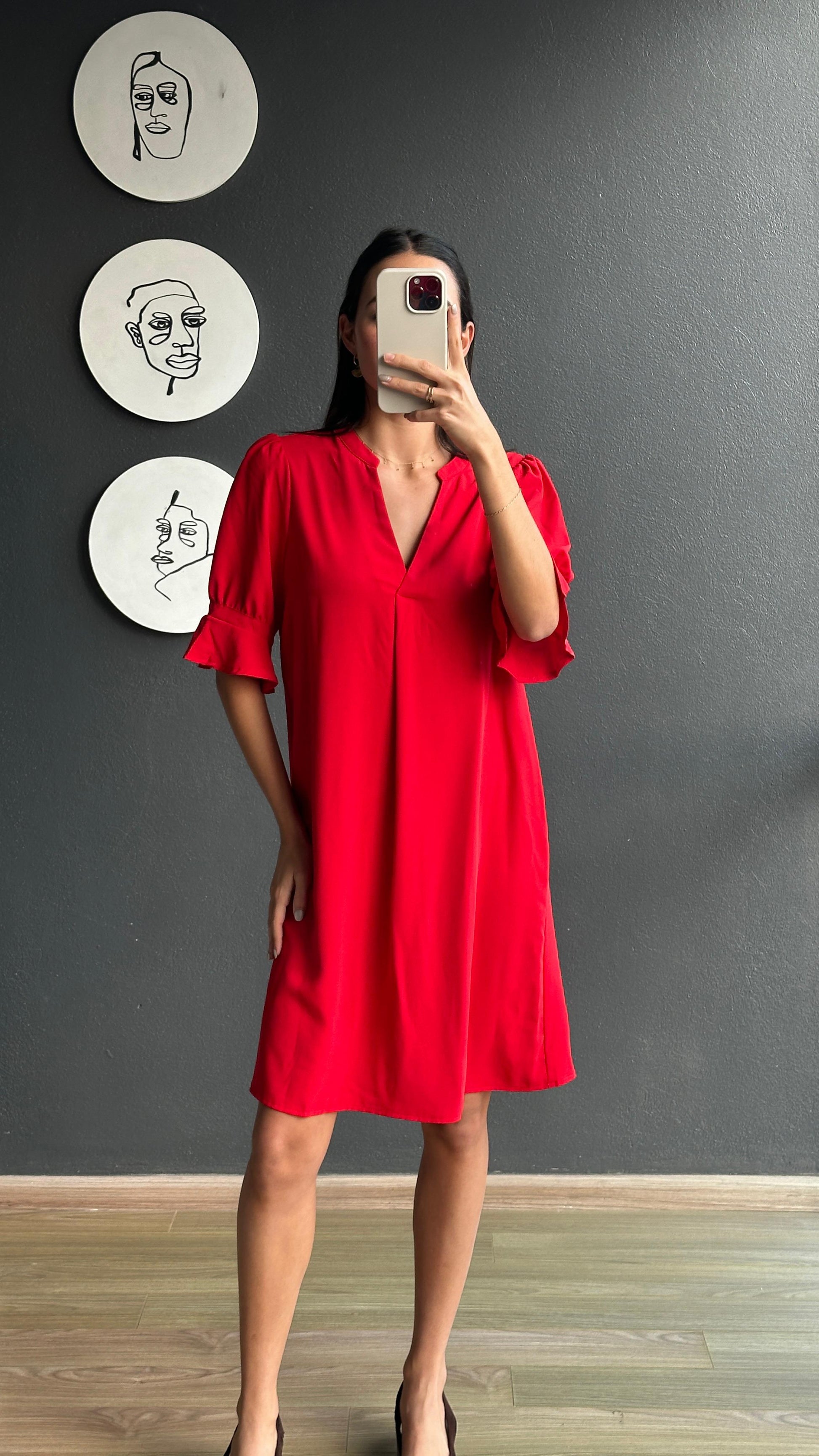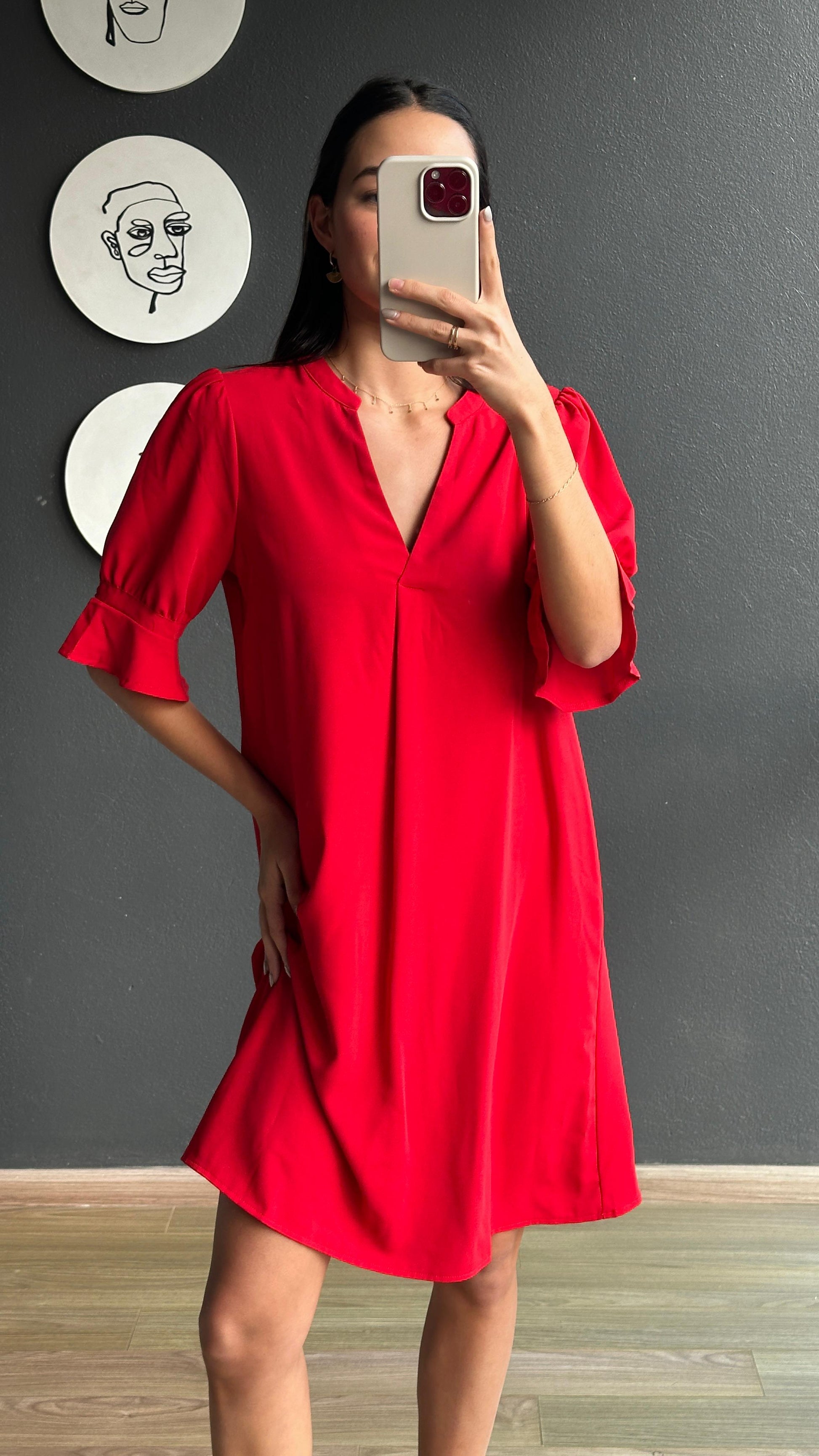 Vestido corto de manga dos cuartos con ligero escote en V.