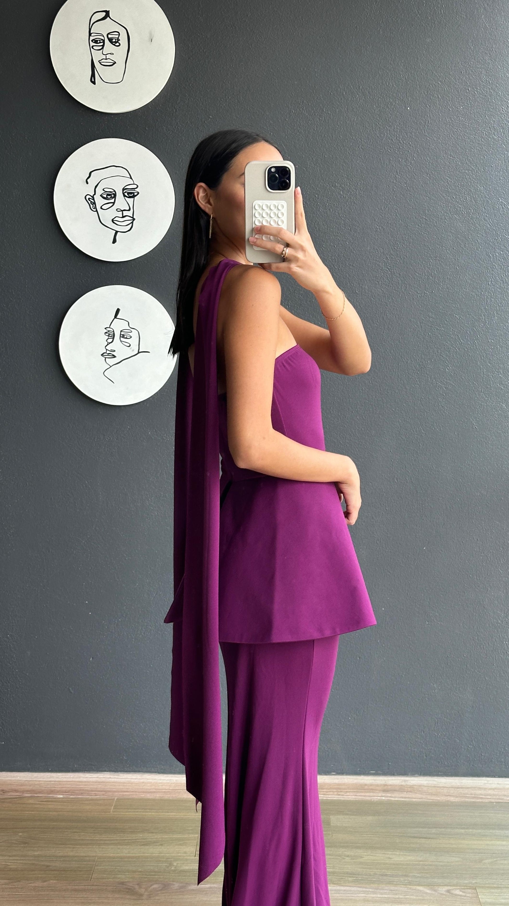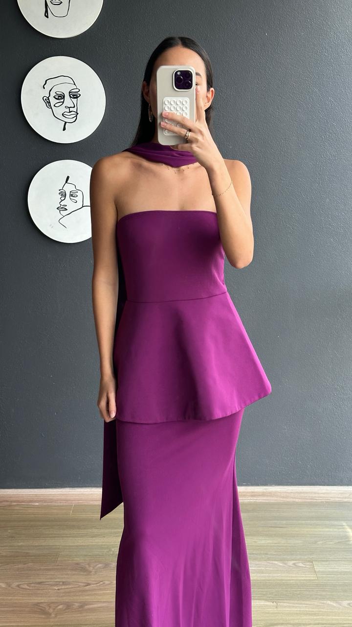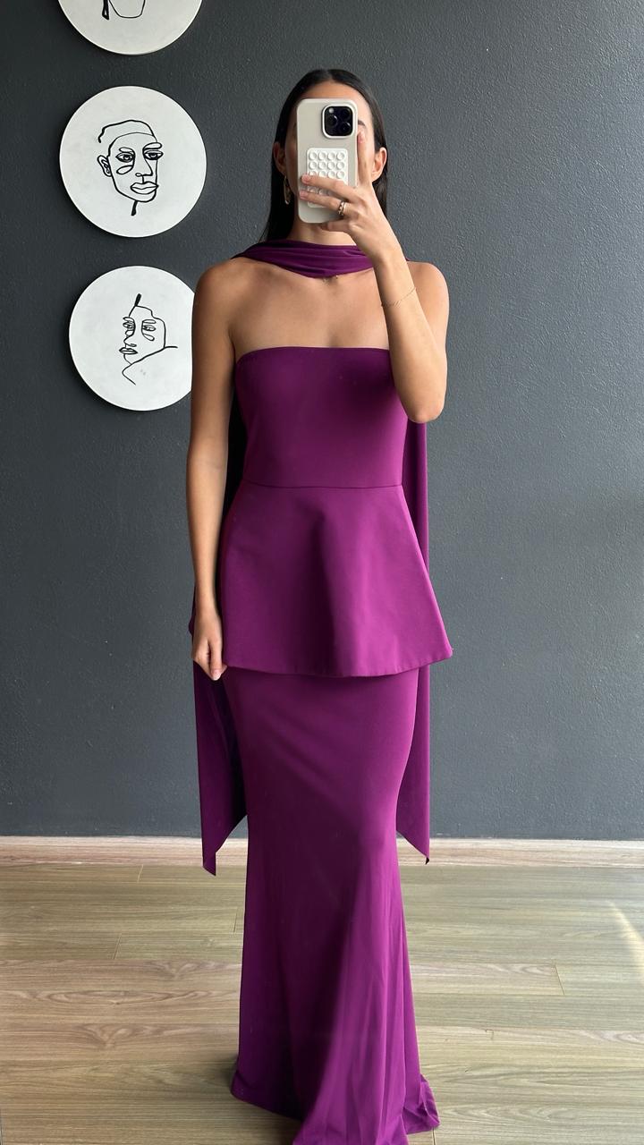 Vestido largo strapless en tono morado profundo, diseñado para ofrecer un estilo elegante y sofisticado. Escote recto aporta un toque moderno y refinado.