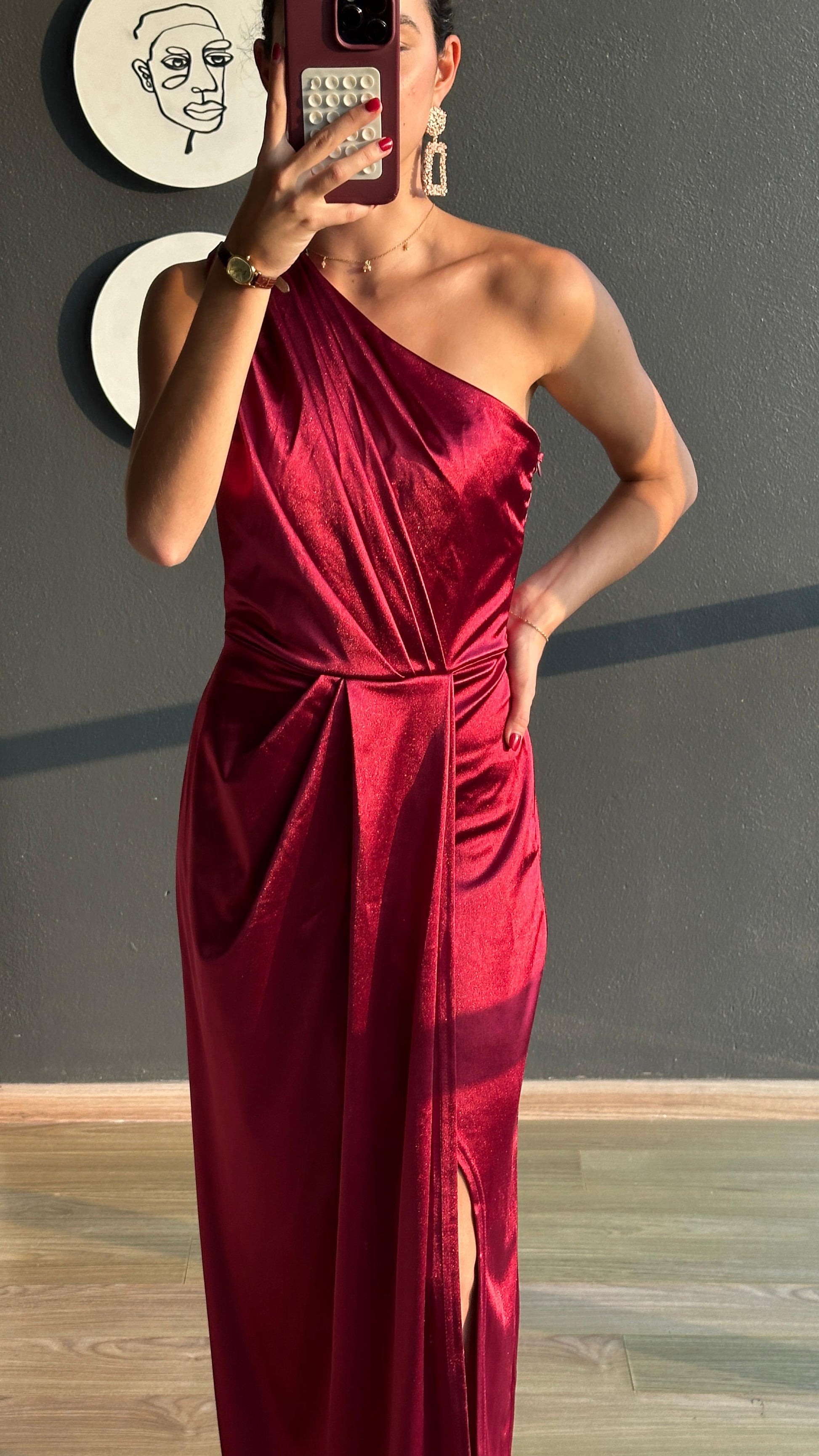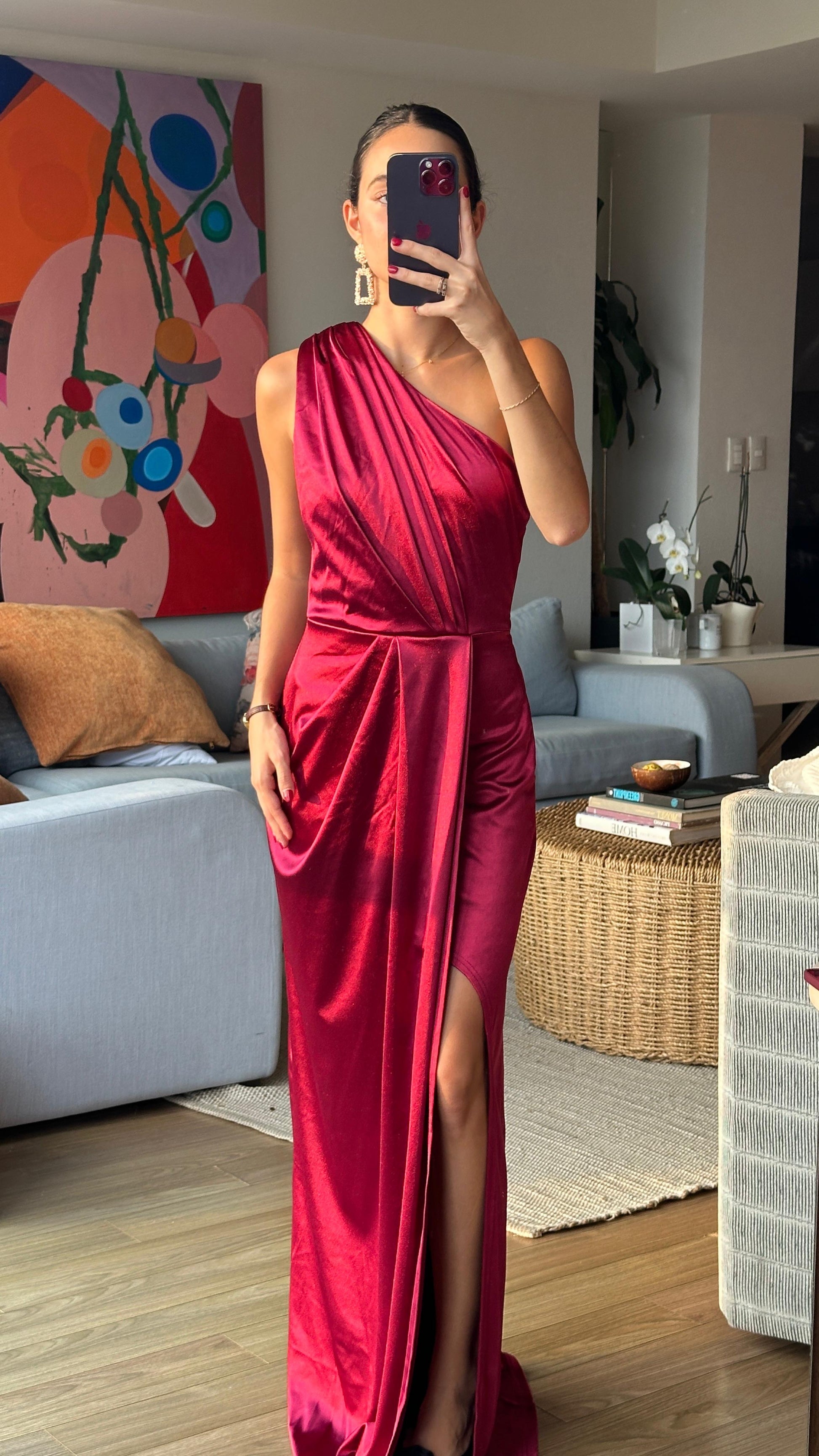 Vestido de un hombro largo, tela satinada con apertura en pierna. Elegante y ligero