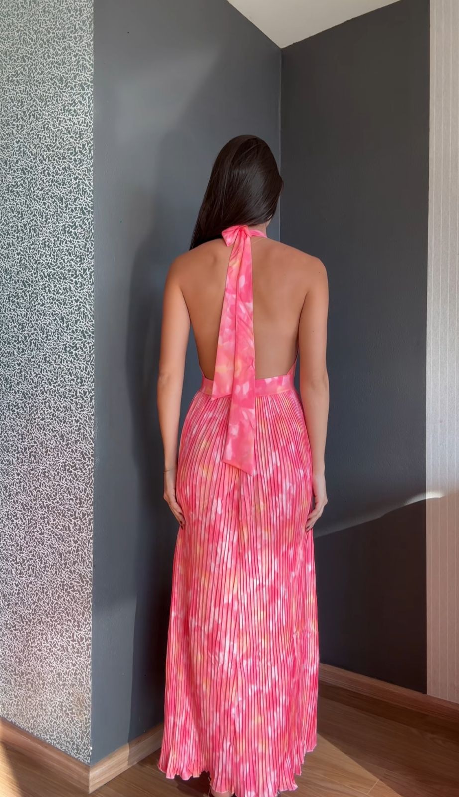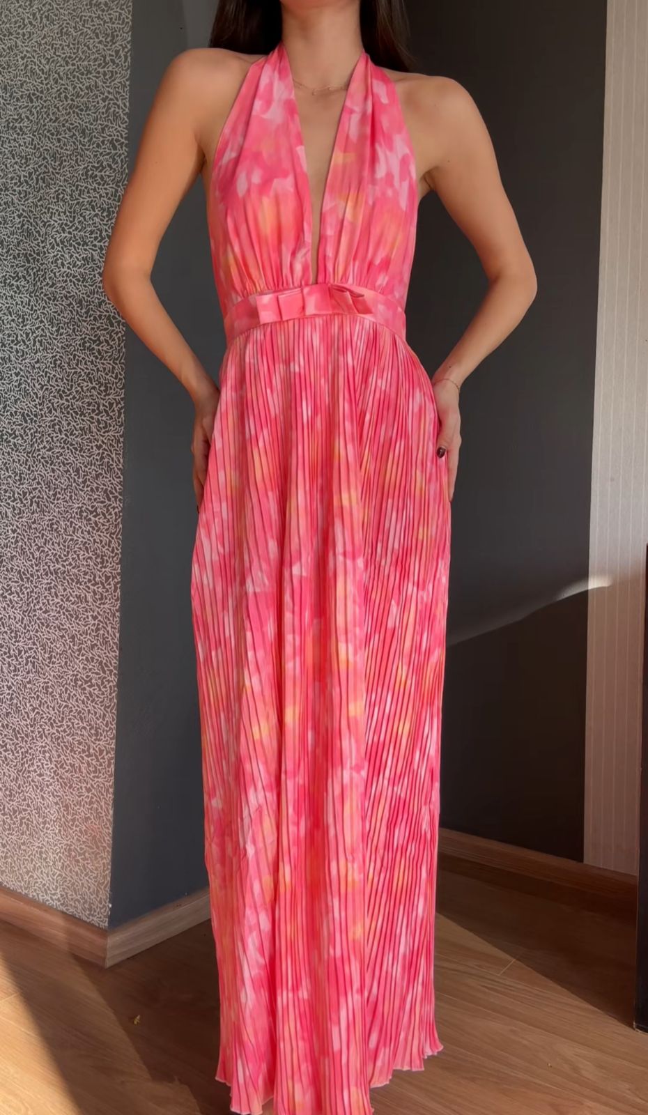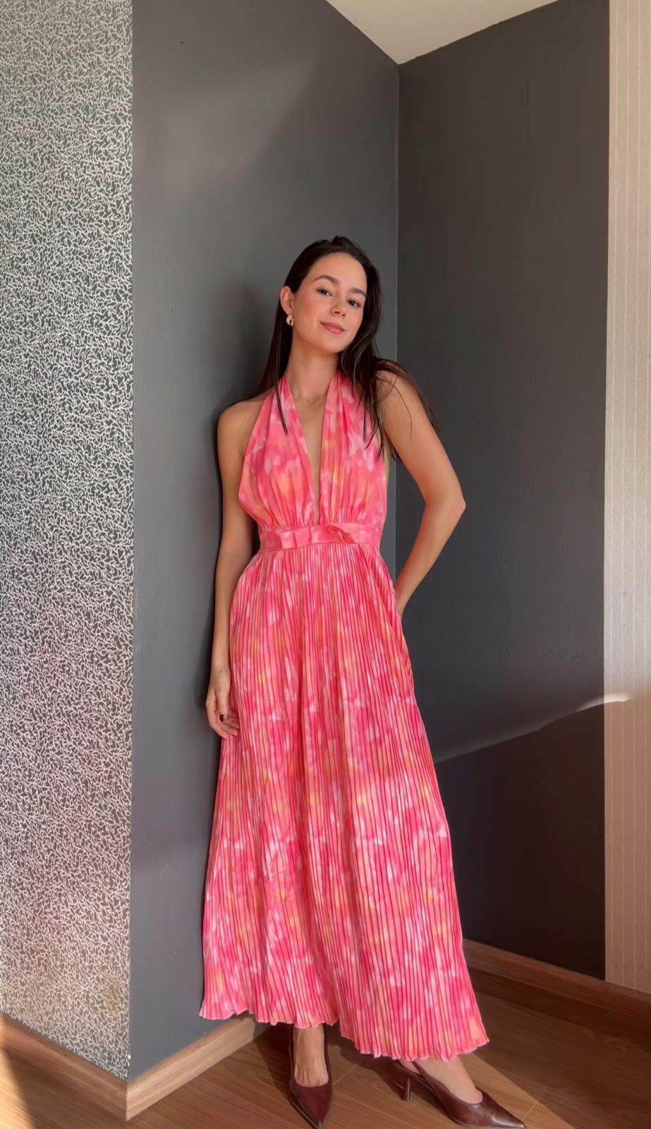 Vestido con escote en V con falda plisada.