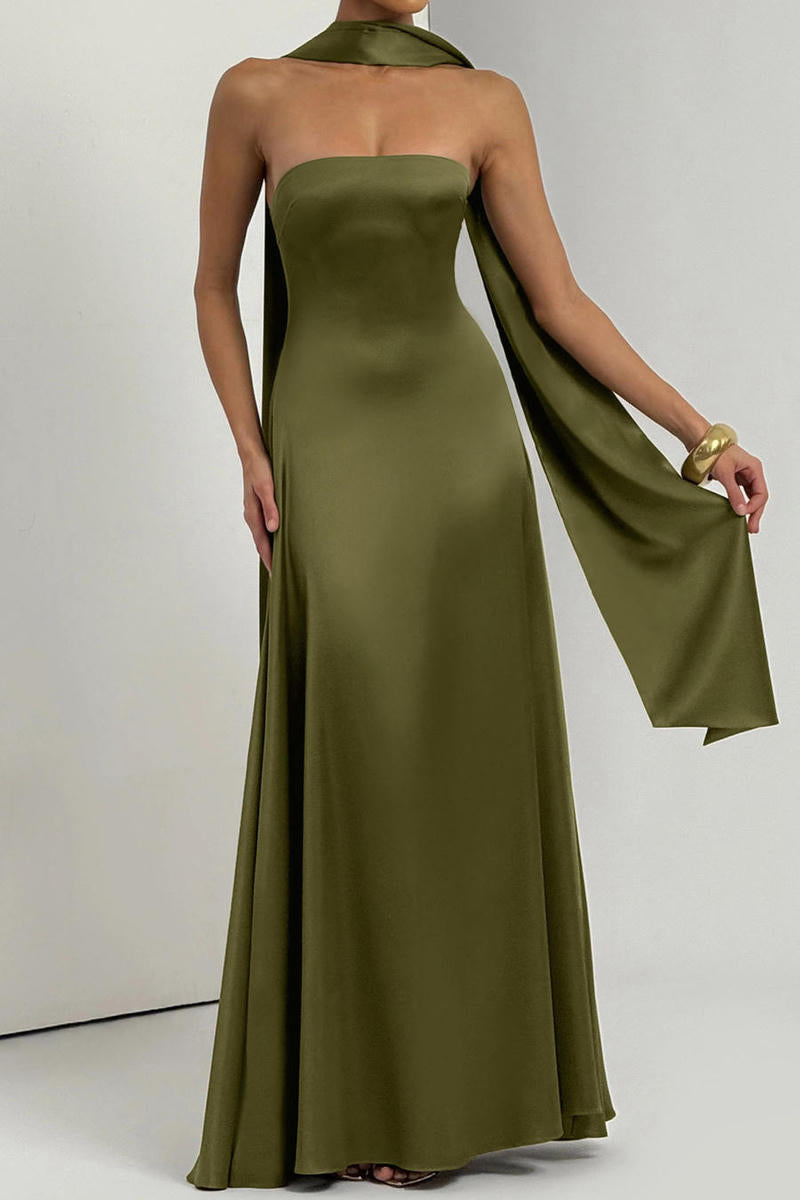 Vestido de tela satinada strapless con bufanda. Cómodo y elegante para cualquier evento formal que tengas.